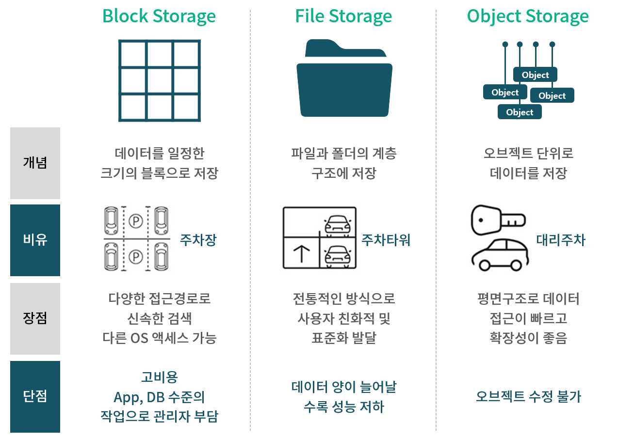 - HTTP 프로토콜 기반 REST API를 사용하여 고유한 ID 통해 데이터를 객체 단위로 처리하는 스토리지
