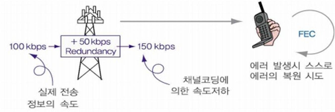 디지털 전송 채널 상의 잡음, 간섭 등에 의해 발생되는 오류를 검출 및 정정하기 위해 송수 양측에 의해 합의된 잉여 비트를 추가하고 복원하는 과정