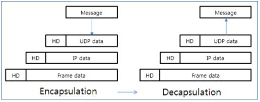 - 네트워크 모델에서 송신자와 수신자가 서로 데이터 통신 시 송신 호스트에서는 상위 어느 프로토콜 데이터 유니트(PDU:Protocol Data Unit)를 다른 하위 프로토콜 데이터 유니트의 데이터 필드에 포함 시키는 과정. 즉, 캡슐화 과정으로 하나의 완성된 데이터를 전송