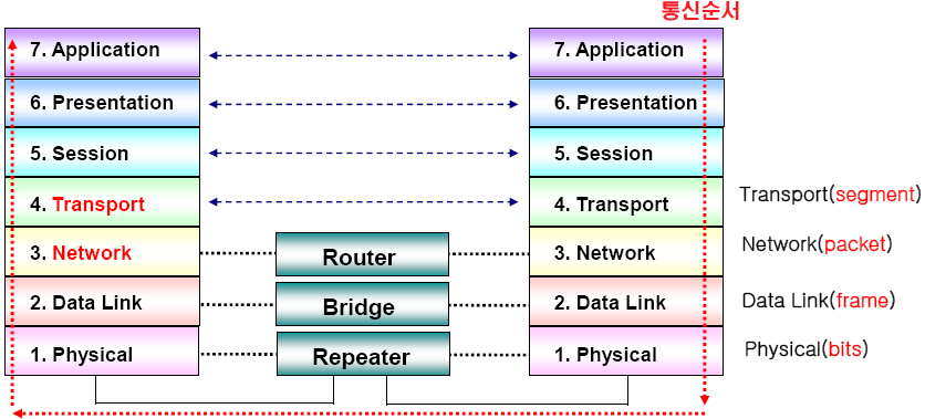 - 모든 네트워크 통신에서 생기는 여러가지 충돌 문제를 완화하기 위하여, 국제표준기구(ISO)에서 표준화된 네트워크 구조를 제시한 기본 모델