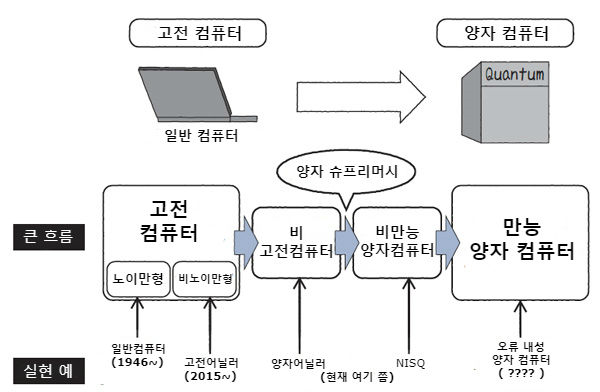(개념) 2023년 시점 기준으로 현시대의 양자 컴퓨터(quantum computer) 기술의 상황을 상징적으로 표현한 말