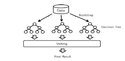 - 각 의사결정 트리 모델 예측값들에 대해 다수결(Hard-voting) 및 평균값(Soft-voting)으로 최종 결정 방법