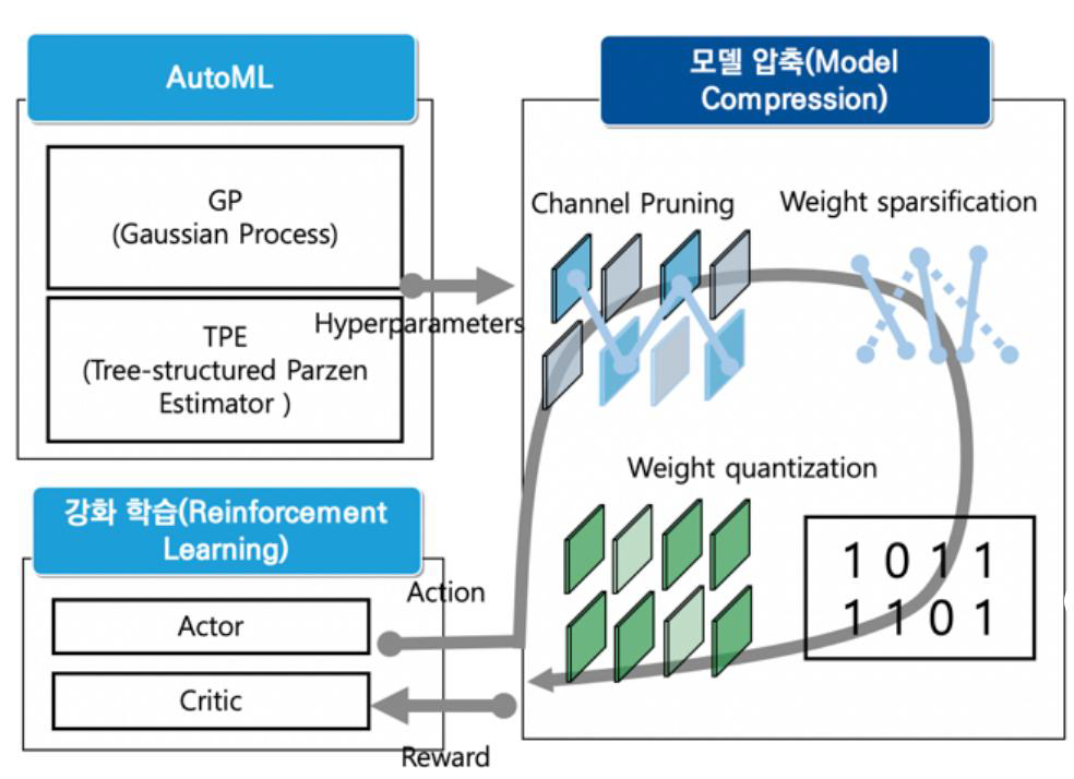- 알고리즘 경량화 연구 중 일반적인 모델 압축 기법을 적용한 강화 학습 기반의 최적 모델 자동 탐색 기술