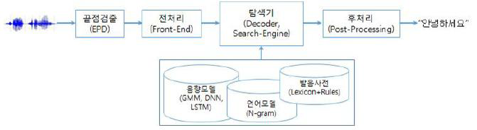 - 끝처리, 전처리, 후처리, 음향모델, 발음사전, 언어모델