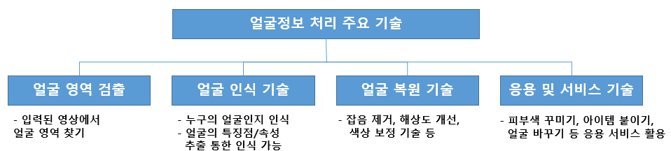 - 얼굴 정보를 검출한 후, 눈, 코, 입 등의 위치를 기술하는 특징점과 성별, 나이, 감정 등의 속성 을 추출하는 기술