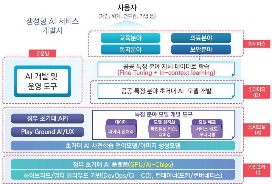 ※ 정부 초거대 AI 인프라/플랫폼을 기반으로 정부부처별로 조정(Adaptation)을 적용하여 공공성과 도메인전문성이 결합된 AI 서비스를 제공