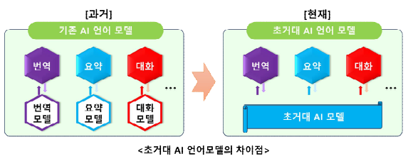 - 대용량의 연산이 가능한 컴퓨팅 인프라를 기반으로 대규모 용량의 데이터를 학습해 특정 용도에 한정하지 않고 종합적이고 자율적으로 사고, 학습, 판단, 행동하는 인간의 뇌 구조를 닮은AI(인공지능)