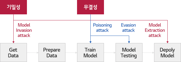 - 학습 데이터에 포함된 기밀정보, 민감정보가 노출되지 않도록 암호화 등의 비식별 처리 방식도 연구