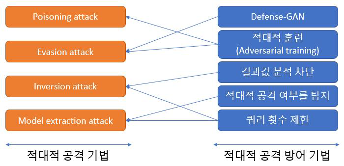 - Poisoning attack, Evasion attack, Inversion attack, Model extraction attack, Defense-GAN, 적대적 훈련(Adversarial training), 결과값 분석 차단, 쿼리 횟수 제한