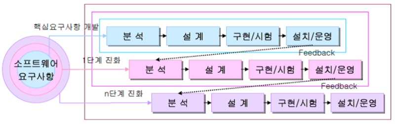 - 사용자의 요구사항 일부분 혹은 제품의 일부분을 반복적으로 개발하여 고품질의 최종 시스템으로 완성해 가는