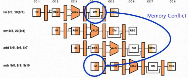 - CC4 시점에서 lw명령과 sub명령이 동시에 메모리 에 접근하여 자원 충돌