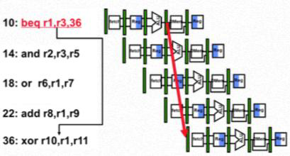 - 10번 라인의 분기 명령의 수행 시점에 파이프라인에 적재된 14, 18번 라인 명령어 미수행 및 36
