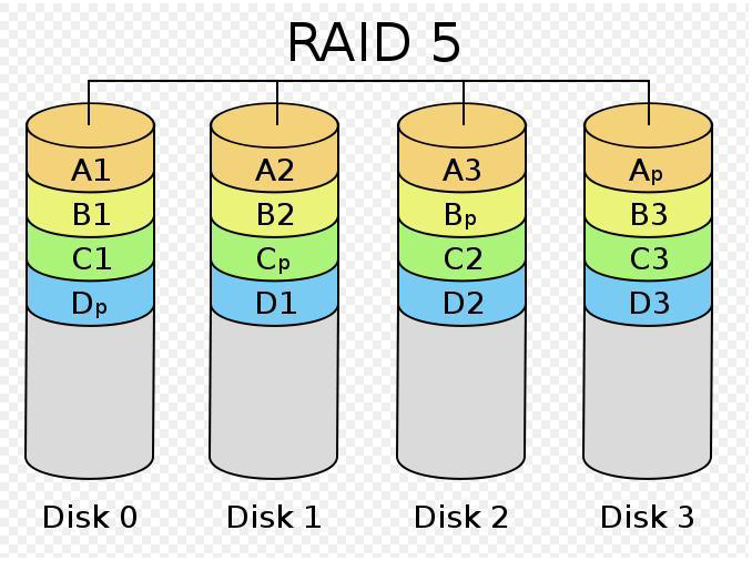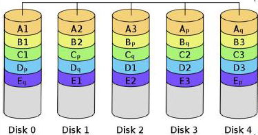 - 여러 개의 디스크에 데이터 중복 저장과 데이터의 분산 저장을 통한 성능 향상과 안정성 향상을 위한 스토리지