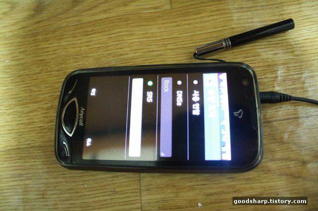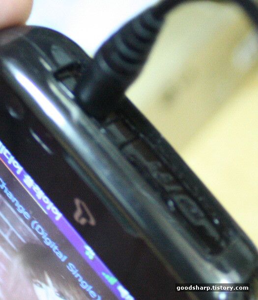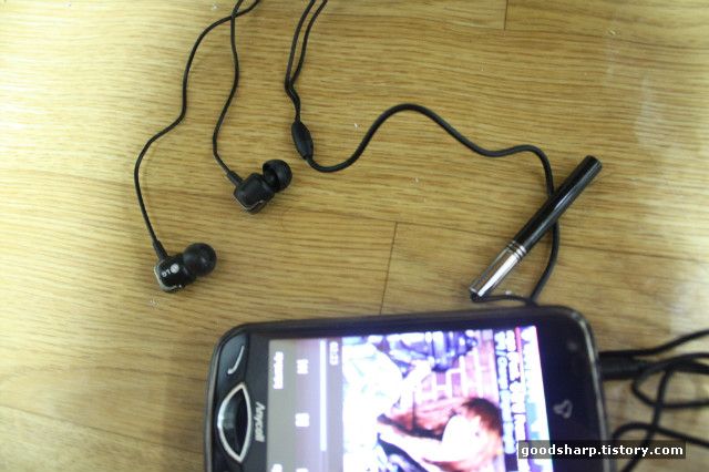 T옴니아2와의 연결 장면이다. 옴니아의 경우에는 연결단자가 위쪽에 있기 때문에 접지 부분에 대한 문제가 있을 거으로 생각이 된다. 일반적으로 핸드폰을 MP3다루듯이 항상 같이 다루지는 않기 때문에 핸드폰의 연결단자로는 조금 부족할 수 도 있을 듯하다.