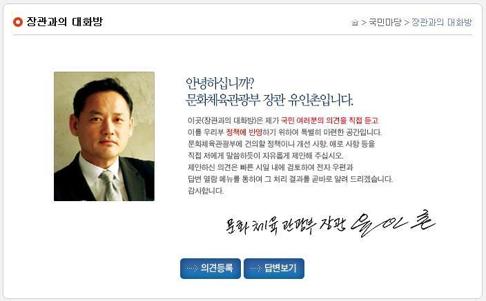 유인촌 장관은 국민의 의견을 듣고 반영하고자 한다는 내용이 써있다.