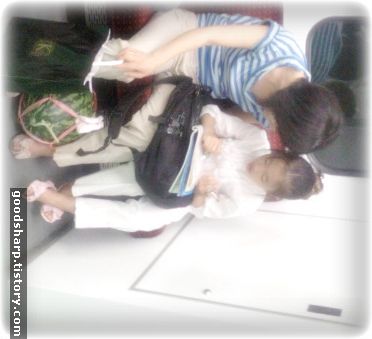 어머니는 한손에는 쇼핑백, 한손에는 수박을 들고 딸래미와 함께 탔다.