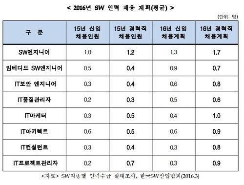 '2016년 SW인력 채용 계획 평균'을 보고