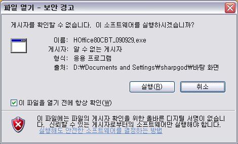 윈도우에서는 기본적으로 보안 경고를 묻는다. 물론 이 부분은 이후 패키지로 배포될 경우 없어야 할 부분이기도 하다.