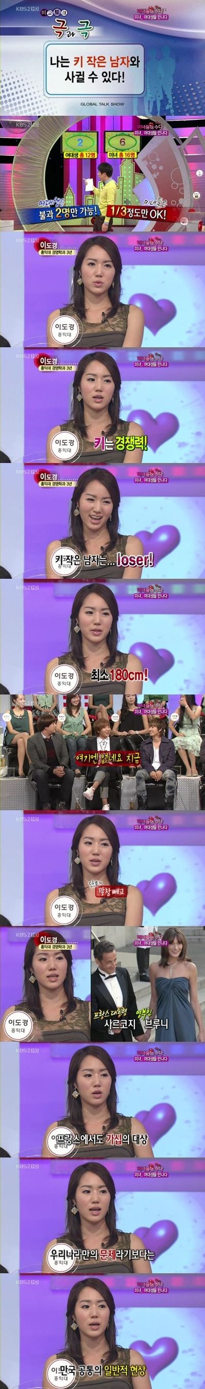 키가 작아서 열이 받는 것이 아니라... 이도경씨의 생각이 제가 보기에는 극단의 생각을 하고 있다고 보이고 미수다라는 지상파 방속에 참석하여, 자신의 뜻을 마치 여성 대부분의 생각이냥 말했다는 것이다.