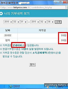 CPC1 링크프라이스 수익이 났습니다. 링크프라이스에서 수익이 났습니다. 큰 금액은 아니지만, 이렇게 수익이 나서 어디에 쓸까 고민하다가... 좋은 일에 써야 겠다는 생각이 들어서 크지는 않지만 굿네이버스에 기부를 했습니다. 그동안 제 블로그에 오신분들에게 이 영광을 돌리고 싶네요. 앞으로도 꾸준히 운영해서 좋은일에 쓰도록 할까 합니다. 2010. 2. 6. 이전 1 다음